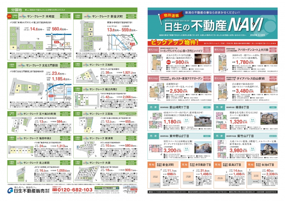 新潟日報(2020年8月28日朝刊)にて「日生の不動産NAVI(ナビ)」の折込広告を配布しました。 今すぐ住みたいマンション派の方、今すぐ住みたい戸建て派の方、新築マイホームをお考えの方それぞれにオススメしたい情報が満載です。 詳しくは、本ページ内 PDFでもご覧いただけます。 また、紙面の都合で掲載できなかった物件も多数ございますので、お探しの物件がございましたらお気軽にお問い合わせください。 日生不動産販売スタッフ一同、皆さまからのご連絡を心よりお待ちしております。