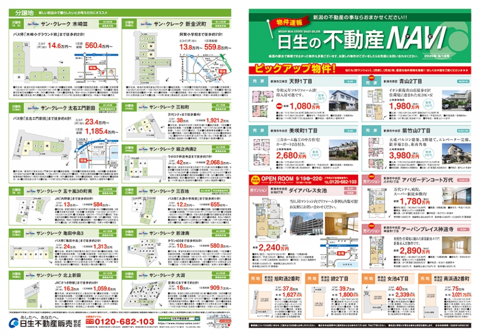 新潟日報(2020年9月18日朝刊)にて「日生の不動産NAVI(ナビ)」の折込広告を配布しました。 今すぐ住みたいマンション派の方、今すぐ住みたい戸建て派の方、新築マイホームをお考えの方それぞれにオススメしたい情報が満載です。 詳しくは、本ページ内 PDFでもご覧いただけます。 また、紙面の都合で掲載できなかった物件も多数ございますので、お探しの物件がございましたらお気軽にお問い合わせください。 日生不動産販売スタッフ一同、皆さまからのご連絡を心よりお待ちしております。