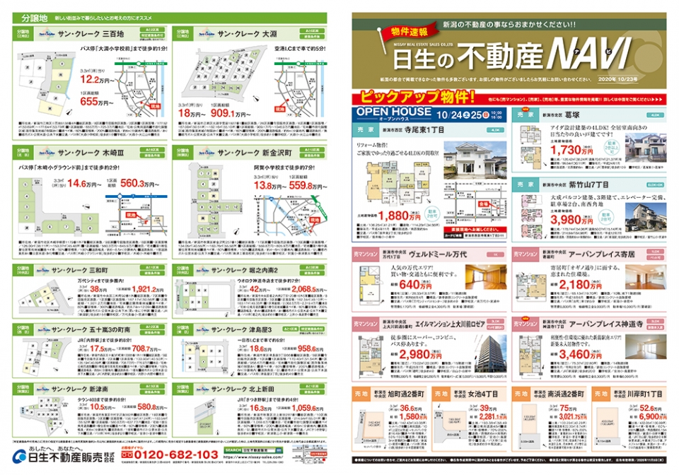新潟日報(2020年10月23日朝刊)にて「日生の不動産NAVI(ナビ)」の折込広告を配布しました。 今すぐ住みたいマンション派の方、今すぐ住みたい戸建て派の方、新築マイホームをお考えの方それぞれにオススメしたい情報が満載です。 詳しくは、本ページ内 PDFでもご覧いただけます。 また、紙面の都合で掲載できなかった物件も多数ございますので、お探しの物件がございましたらお気軽にお問い合わせください。 日生不動産販売スタッフ一同、皆さまからのご連絡を心よりお待ちしております。