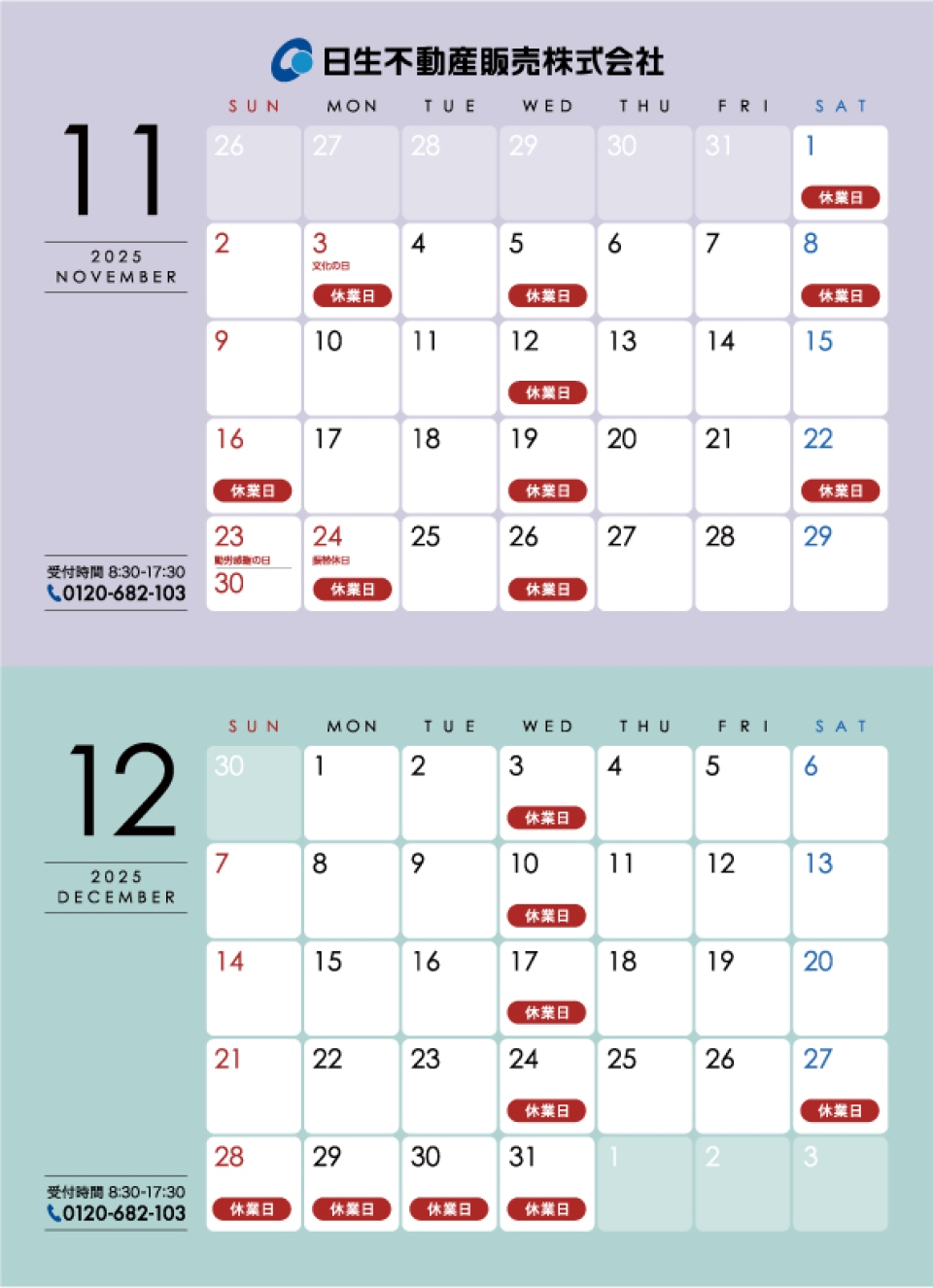 なお、分譲地担当者(サン・クレーク)および日生不動産(株)とは休業日が異なります。