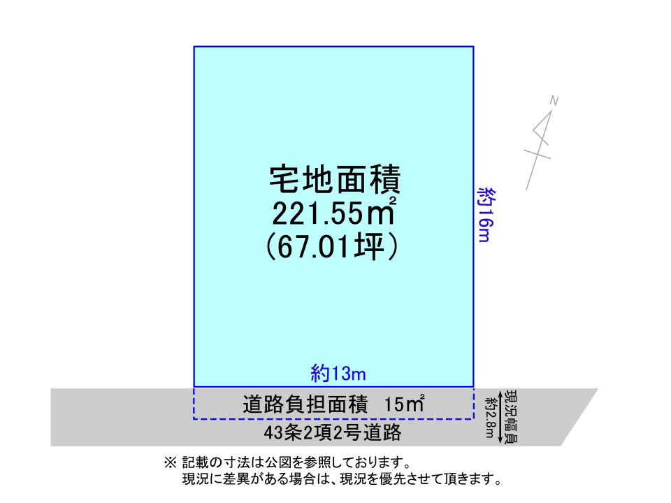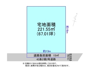 | 備考 | ※確定測量実施予定 ※前面道路は建築基準法外につき、建築には建築基準法43条2項2号の 規定による許可申請必要 |