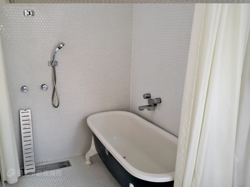 ◆ガラス張りのバスルームの先には、置き型の浴槽に、無駄を取り除いたサニタリースペース。