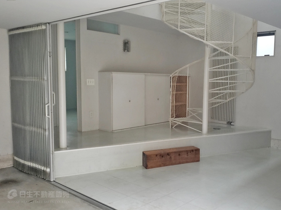 ◆象徴的な螺旋階段を上ると、広々としたLDKは18帖超。無機質な白い天井壁に、どこか懐かしいパーケットフローリングの組み合わせ。