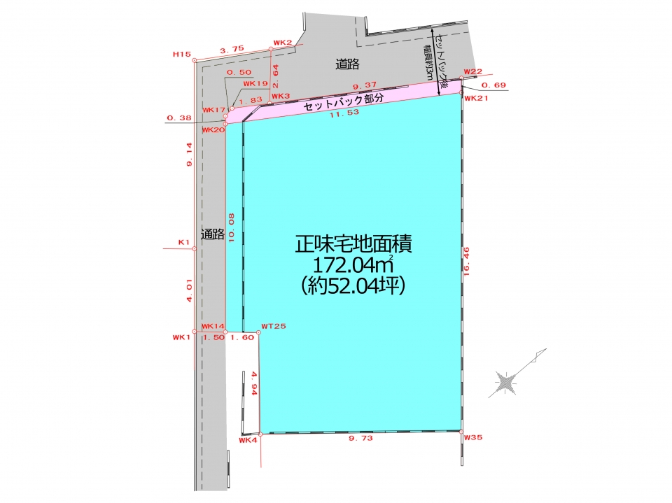 | 備考 | ※現況更地 ※確定測量済み ※給水管は隣地を経由して引込有り。引込直しは買主負担。 ※下水、ガスは前面道路敷設有り。 ※北西側道路:セットバック後の幅員最大約4m。南西側は通路。 |