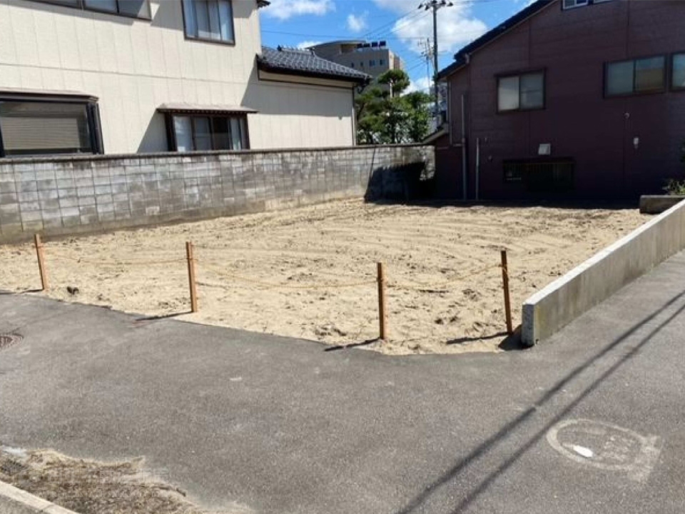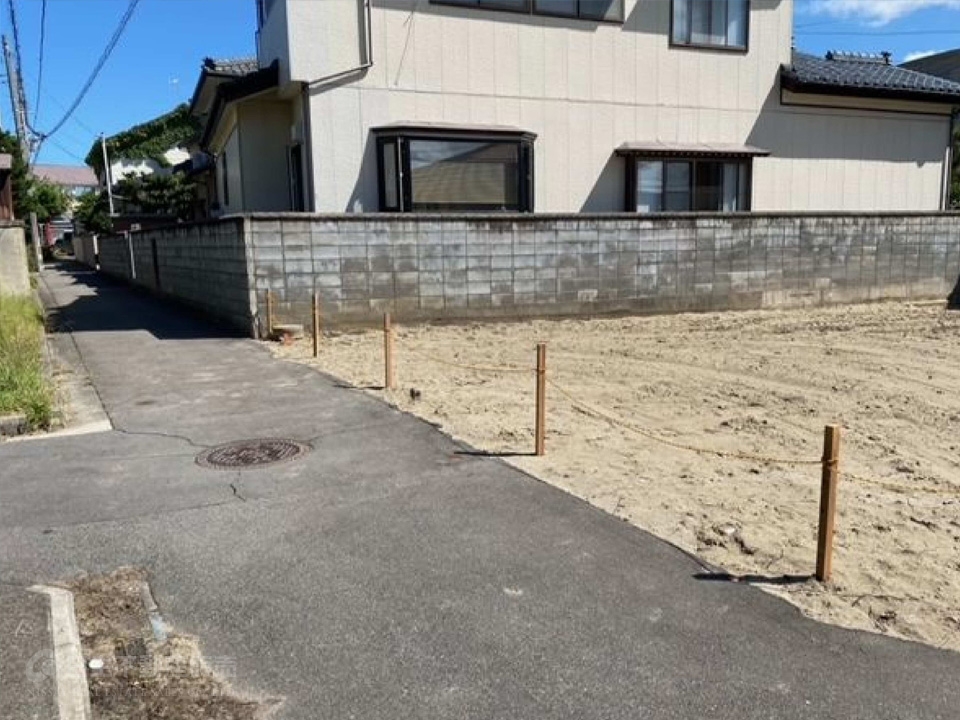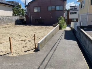 | 備考 | ※現況更地 ※確定測量済み ※給水管は隣地を経由して引込有り。引込直しは買主負担。 ※下水、ガスは前面道路敷設有り。 ※北西側道路:セットバック後の幅員最大約4m。南西側は通路。 |